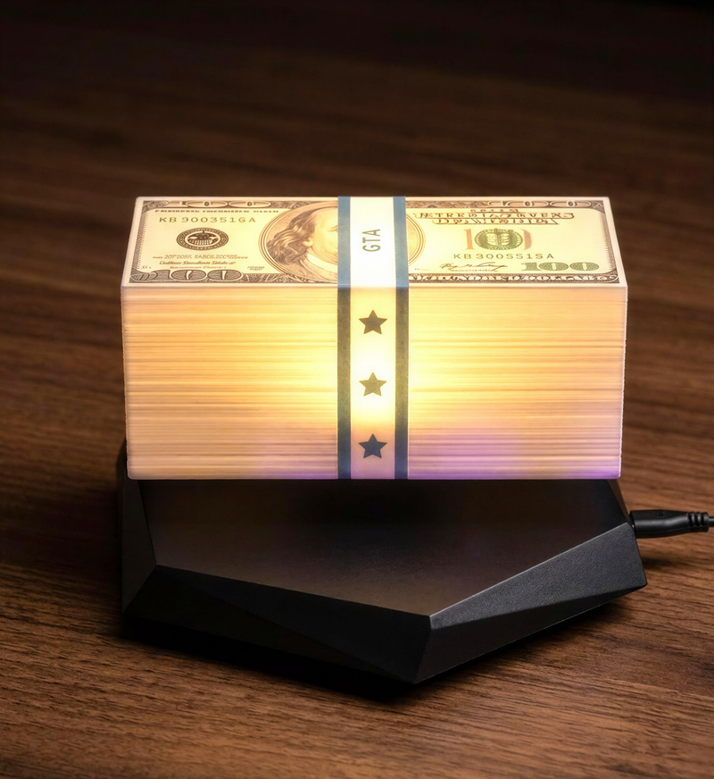 Magnetic levitation suspends the bill in mid-air while the LED base lights it from below.